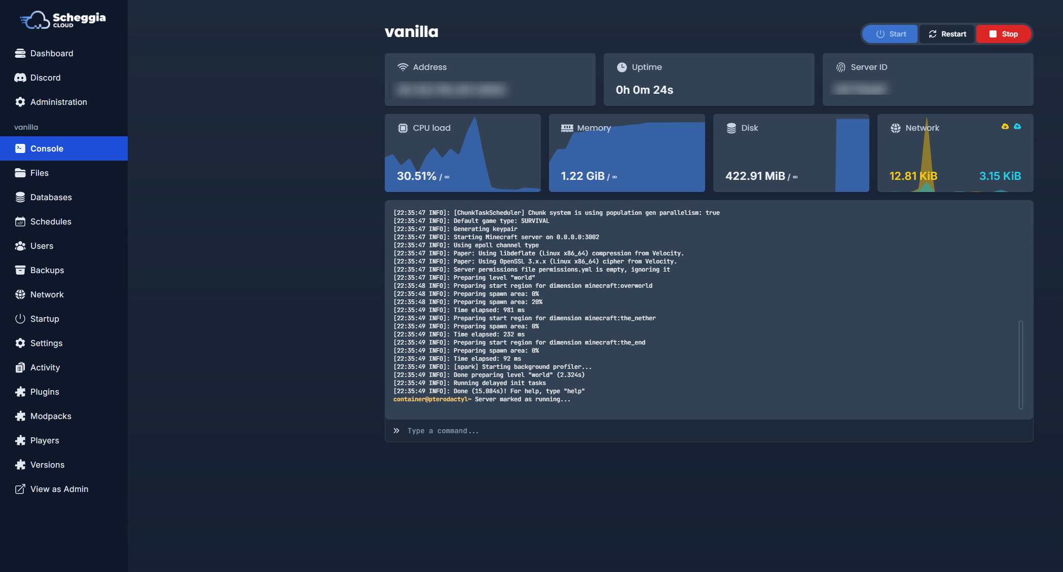 Attraverso il nostro pannello di gioco potrai gestire semplicemente il tuo server Minecraft. Sono disponibili configurazioni di base ed avanzate per gli utenti più esperti. È possibile visualizzare la console del server, riavviarlo, caricare i file (tramite pannello o SFTP) e molto altro ancora.